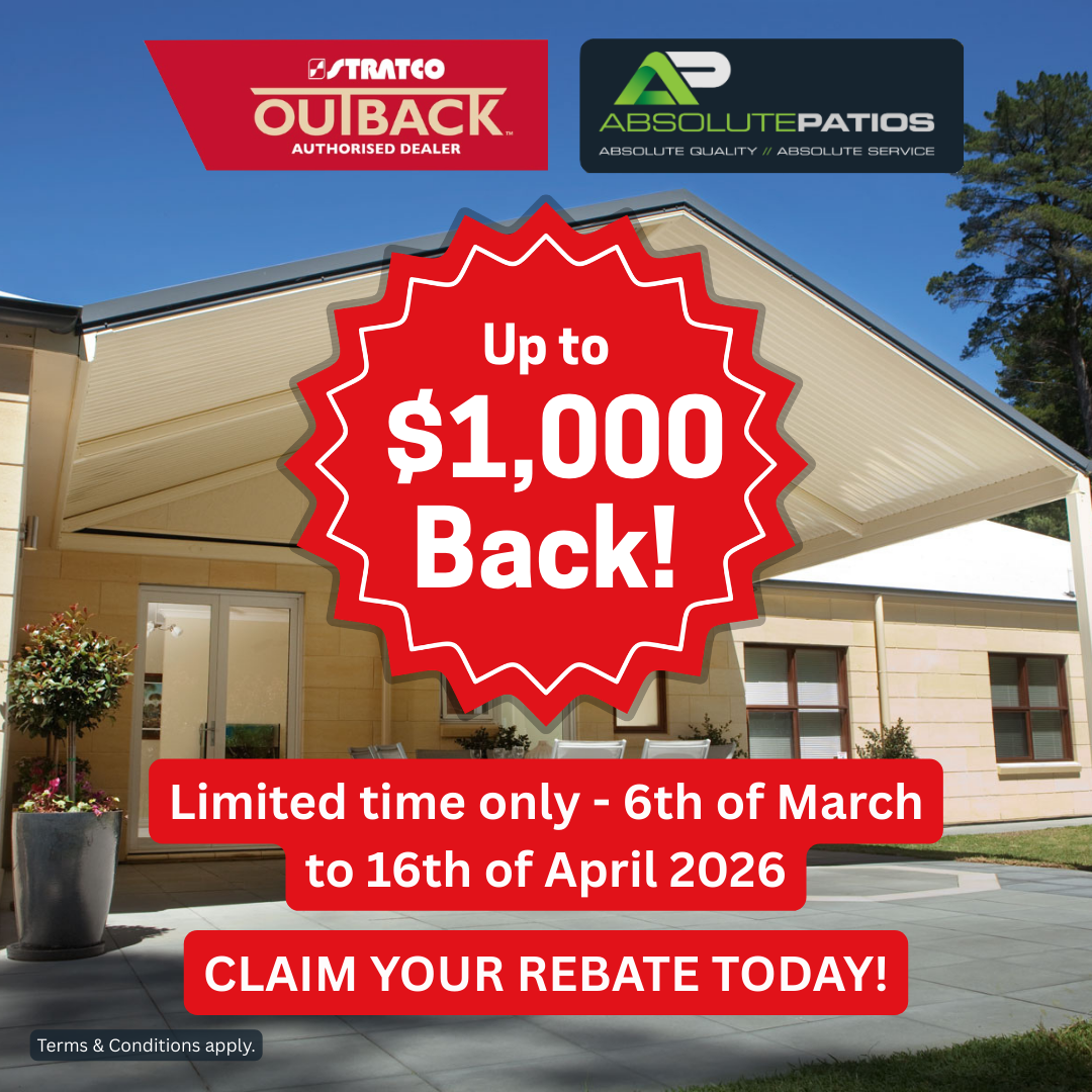 Don’t miss out! From 6th of March to 16th of April 2026, you can claim up to $1,000 cash back on a brand-new Stratco Outback® or Pavilion Patio.